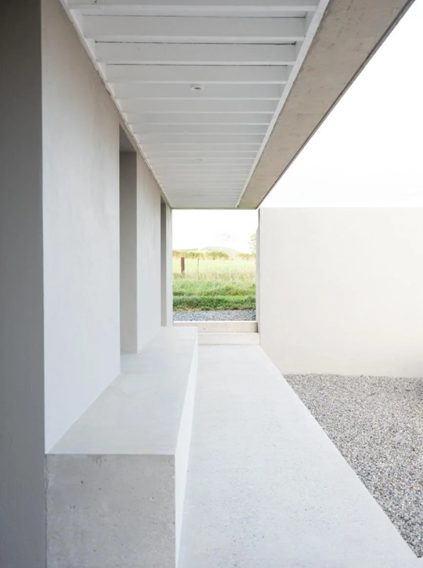 This new home near Kilkenny is designed around a series of calm, walled garden spaces that bring light and landscape into everyday life. A long stone wall leads to a welcoming entrance courtyard, where a fair-faced concrete beam frames the threshold. Inside, a roof-lit central hall unfolds in four directions towards open, glazed living areas that connect seamlessly with terraces beyond. Upstairs, the staircase leads to quiet rooms and a bathroom that capture distant views — a house shaped by light, material honesty, and a sense of quiet enclosure.